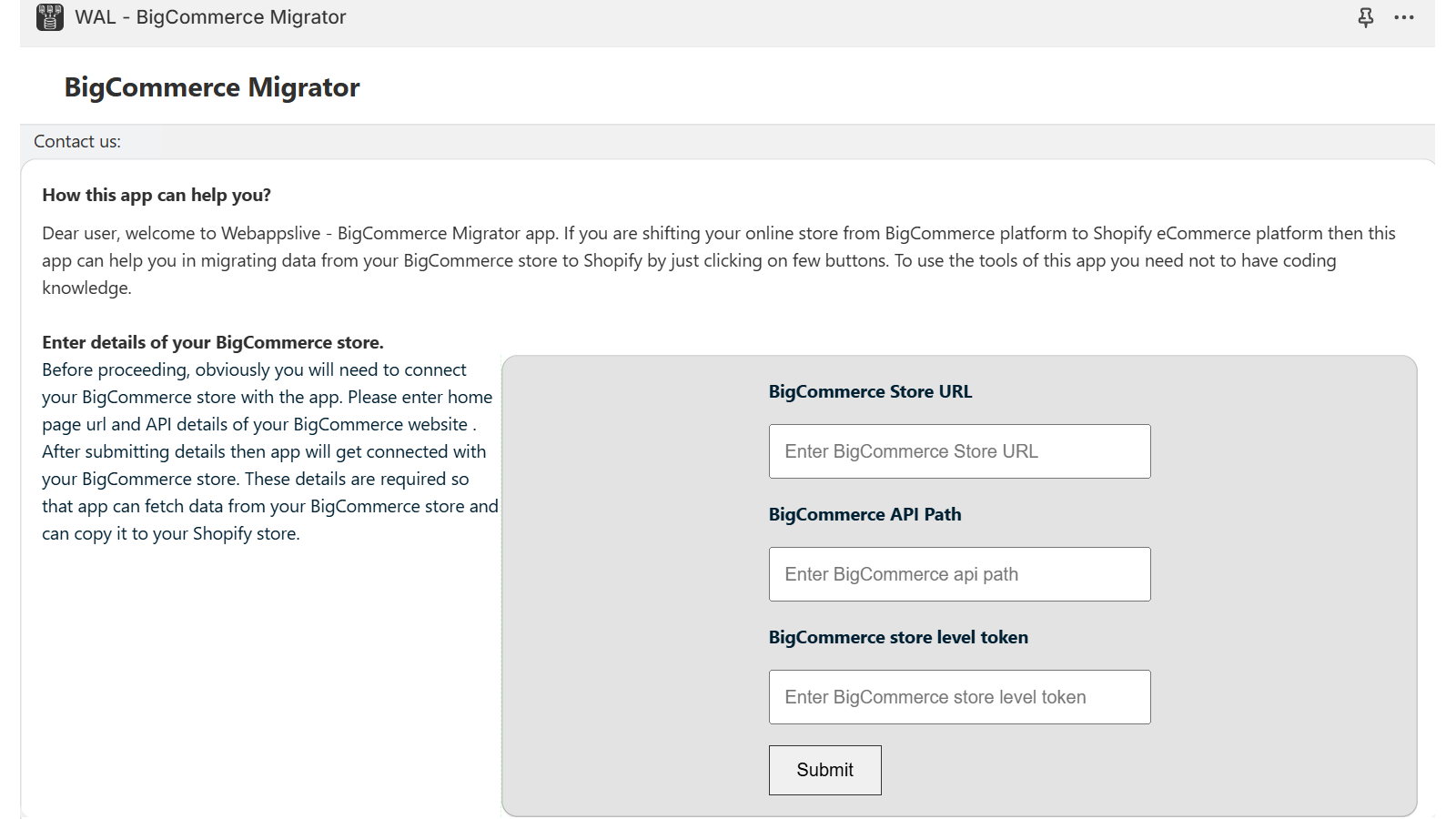 This app helps merchants to migrate products related data like, titles, descriptions, variants, images, etc. in just a few simple steps, no need to work on data files when this app can do the same data migration task in just a few clicks. This app is very easy to use. Data migration through this app is as simple as clicking on buttons and links. Watch our video to know how simple it is to migrate data from BigCommerce store to Shopify store.