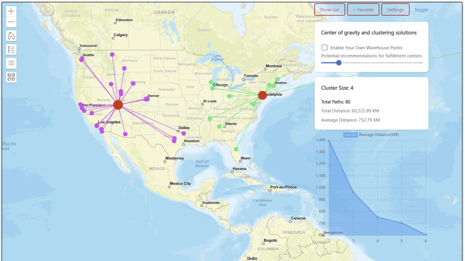 Warehouse Wizard assists merchants in finding potential candidates for 3PL fulfillment centers. The application presents merchants with an app showing order distribution for your store, allowing you to quickly compare and calculate potential costs associated with the distribution centers listed in our database. You can select the number of distribution centers you are looking for and plan ideal locations through an innovative center of gravity algorithm.