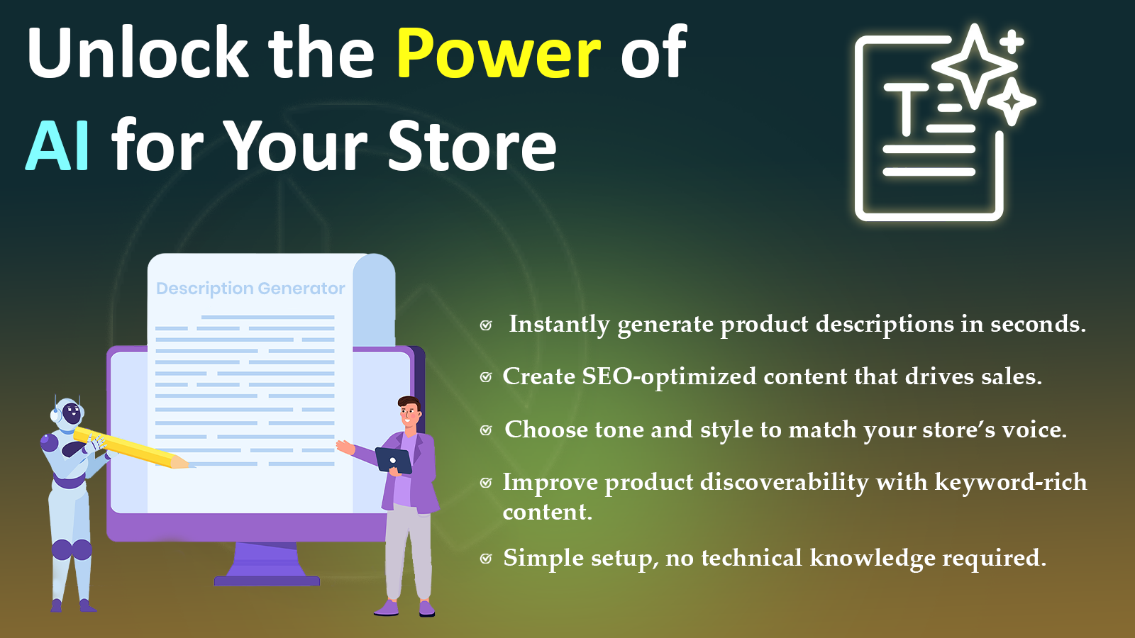 Our app uses AI to generate product descriptions quickly and accurately, saving merchants valuable time. Instead of writing or translating text manually, you can create clear, SEO-friendly descriptions in just a few clicks. The app works with all products, including third-party modules, ensuring consistency across your store. By automating content creation, it helps you keep product pages updated, improve readability, and manage store content more efficiently.