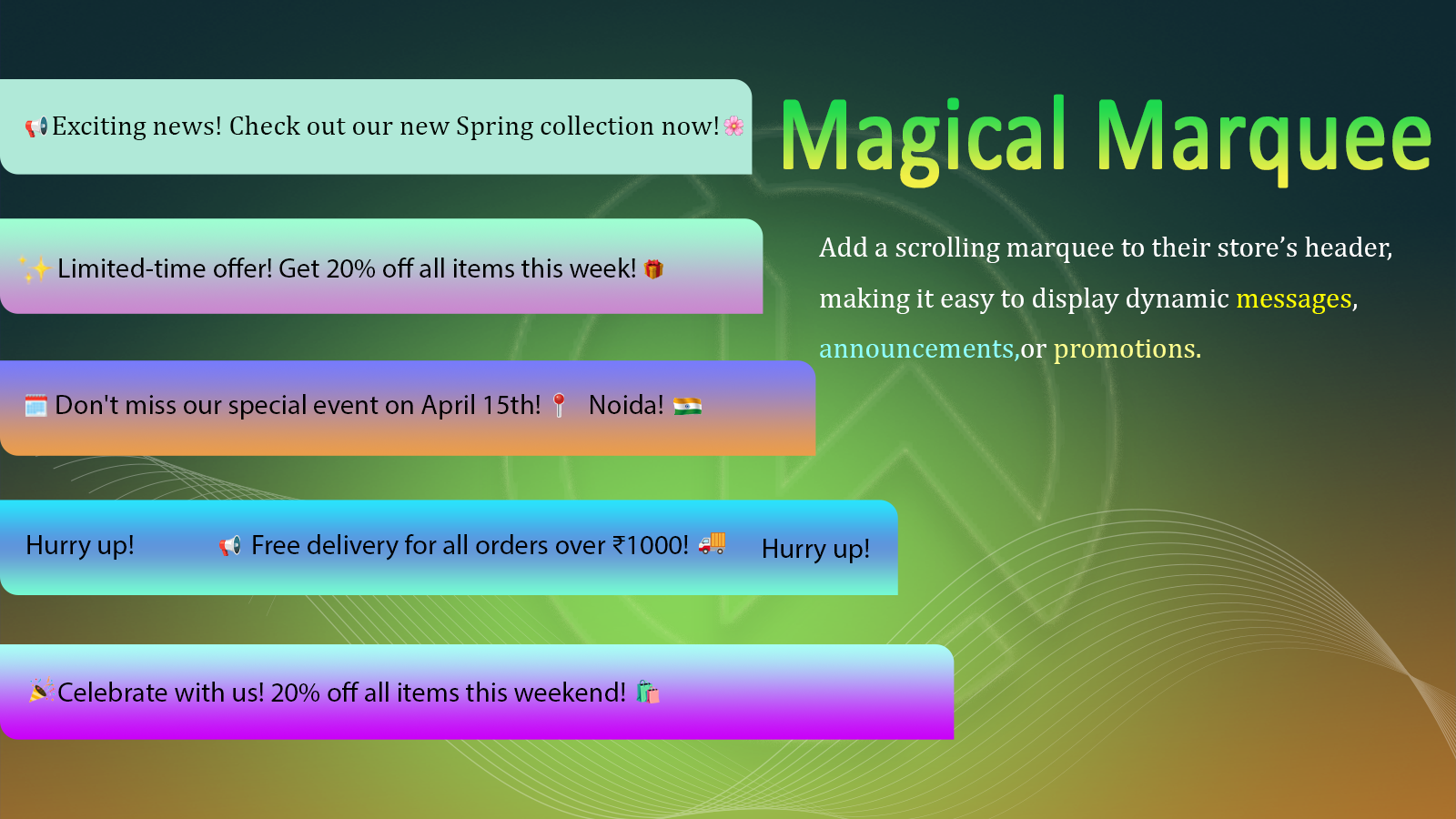 Display animated scrolling messages on your store to highlight offers, updates, or announcements.