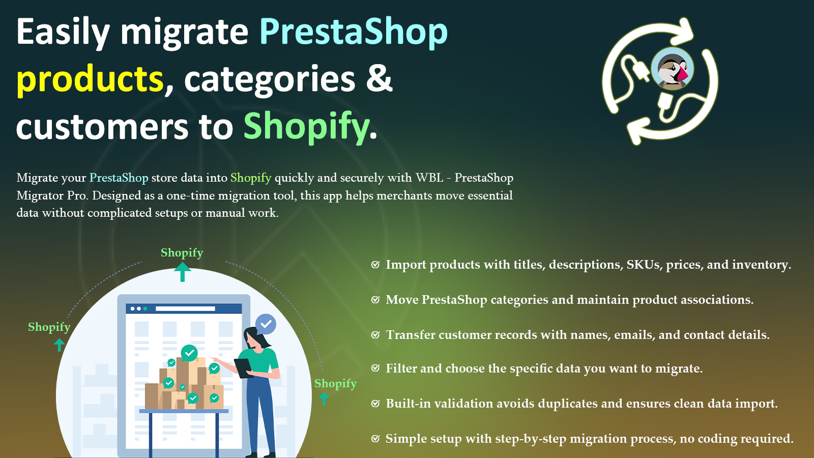 Migrate your PrestaShop store to Shopify quickly and securely with WBL - PrestaShop Migrator Pro. Whether you’re moving your entire catalog or just selected data, our app ensures a smooth transition without downtime. With advanced filtering options, you have full control over which products, categories, and customers you want to migrate. Skip duplicates automatically, view detailed activity logs, and track migration status in real time. Perfect for merchants switching from PrestaShop to Shopify.