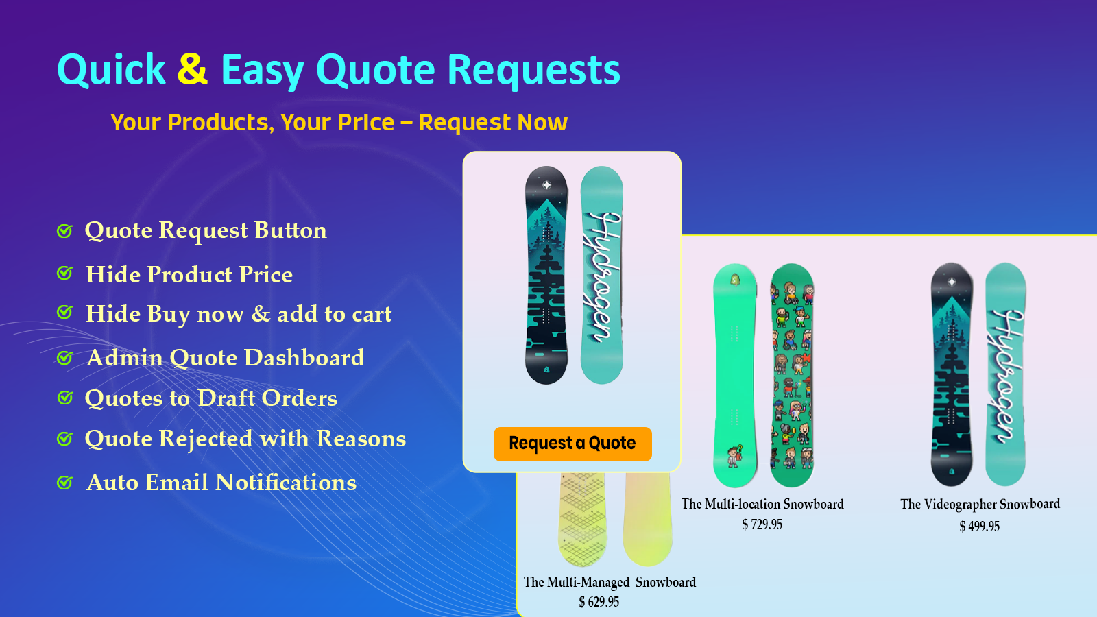 WBL - Request a Quote helps merchants who sell custom or bulk products by allowing customers to request quotes instead of making direct purchases. This simplifies negotiation and enables personalized offers, improving customer engagement. Merchants can easily manage quote requests, respond with tailored offers, and turn them into orders—all within Shopify. Ideal for B2B and specialized sales, this app streamlines the buying process and enhances sales opportunities.