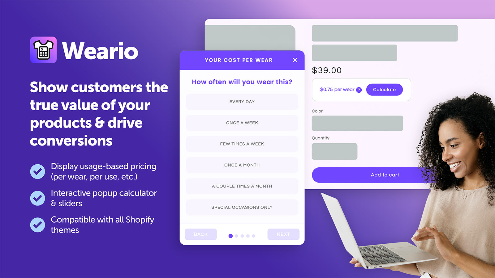Beat fast fashion & maximize value with interactive cost-per-wear calculations that make any price affordable for shoppers. Let customers create their own calculations; the Weario™ calculator popup features seasonal usage & lifetime value with fun animations. Integrates seamlessly across product, collection, & cart pages with advanced brand styling to help drive sales. Compatible with Shopify vintage, 2.0, & Horizon themes with multi-currency support. Turn sticker shock into purchase excitement.