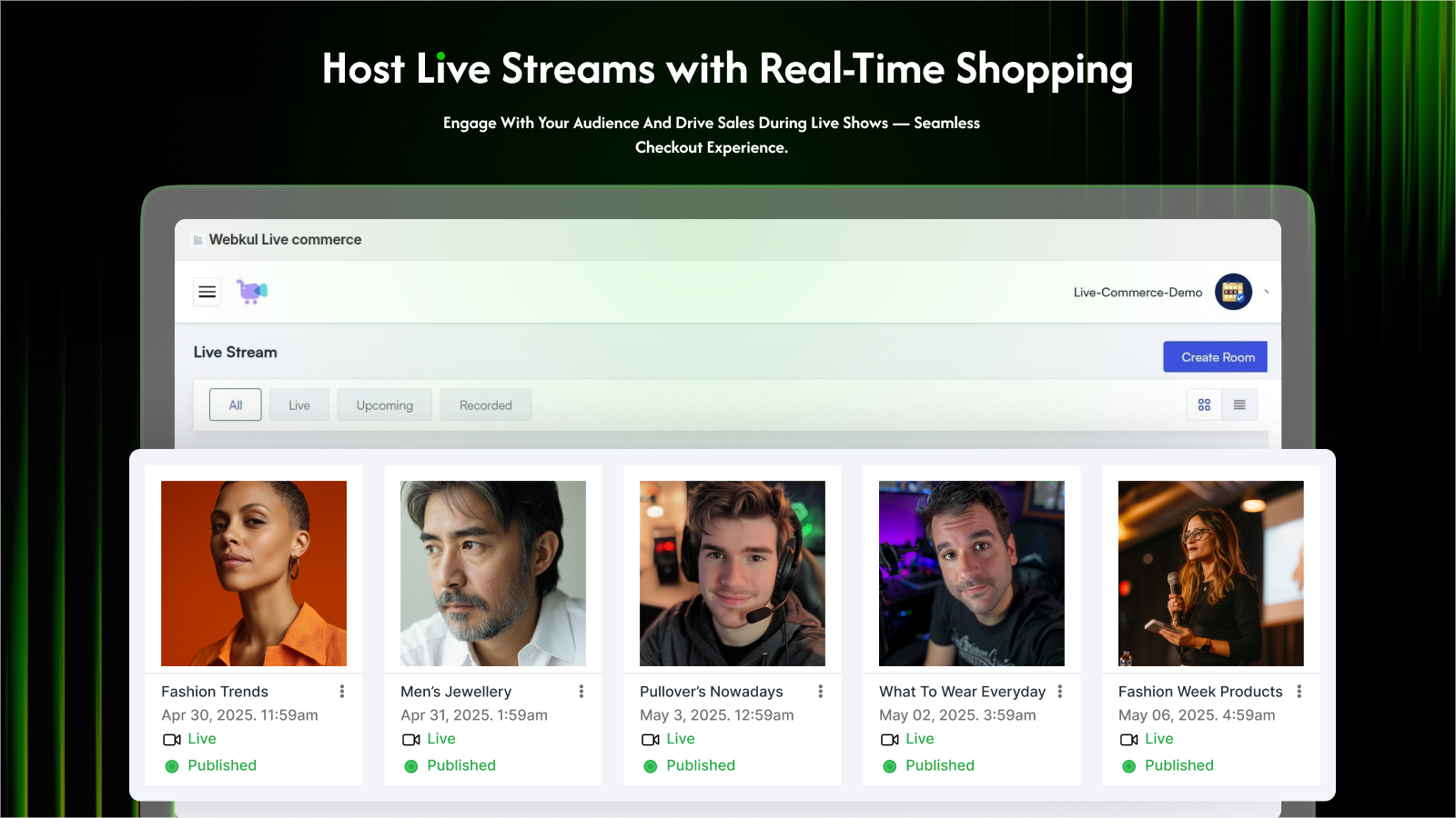 Webkul Live Commerce is a powerful video commerce platform to get more sales with shoppable videos and live shopping. Host live streams, create product-focused video content, and engage buyers in real time. Add video sliders, autoplay videos, product galleries, and lookbooks. Send notifications, track performance via dashboard, and get conversions. Easily embed on your store, Shop app, emails, and more. Import reels, TikToks, stories, and beyond