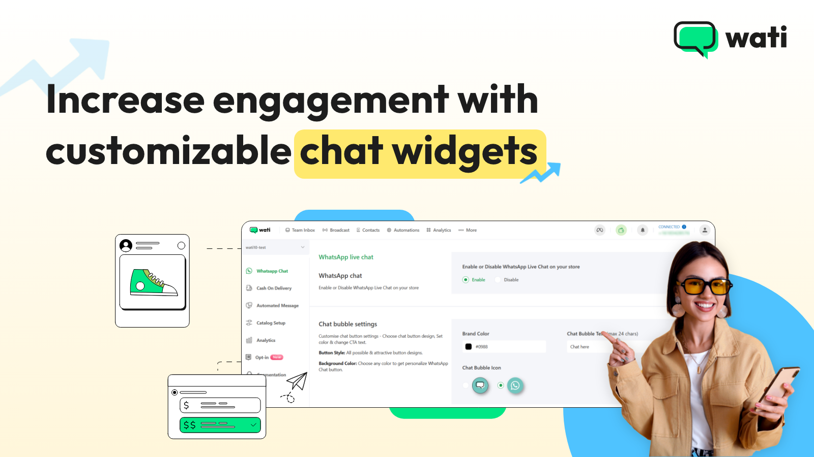 Wati helps you recover abandoned carts and boost sales with WhatsApp API tools. Use WhatsApp broadcasts, no-code chatbots, and delivery reminders to enhance your sales, support, and marketing. Confirm orders via WhatsApp to reduce return rates and automate order updates for better customer service. Manage chats efficiently with a shared team inbox and build trust with a WhatsApp Green Tick.