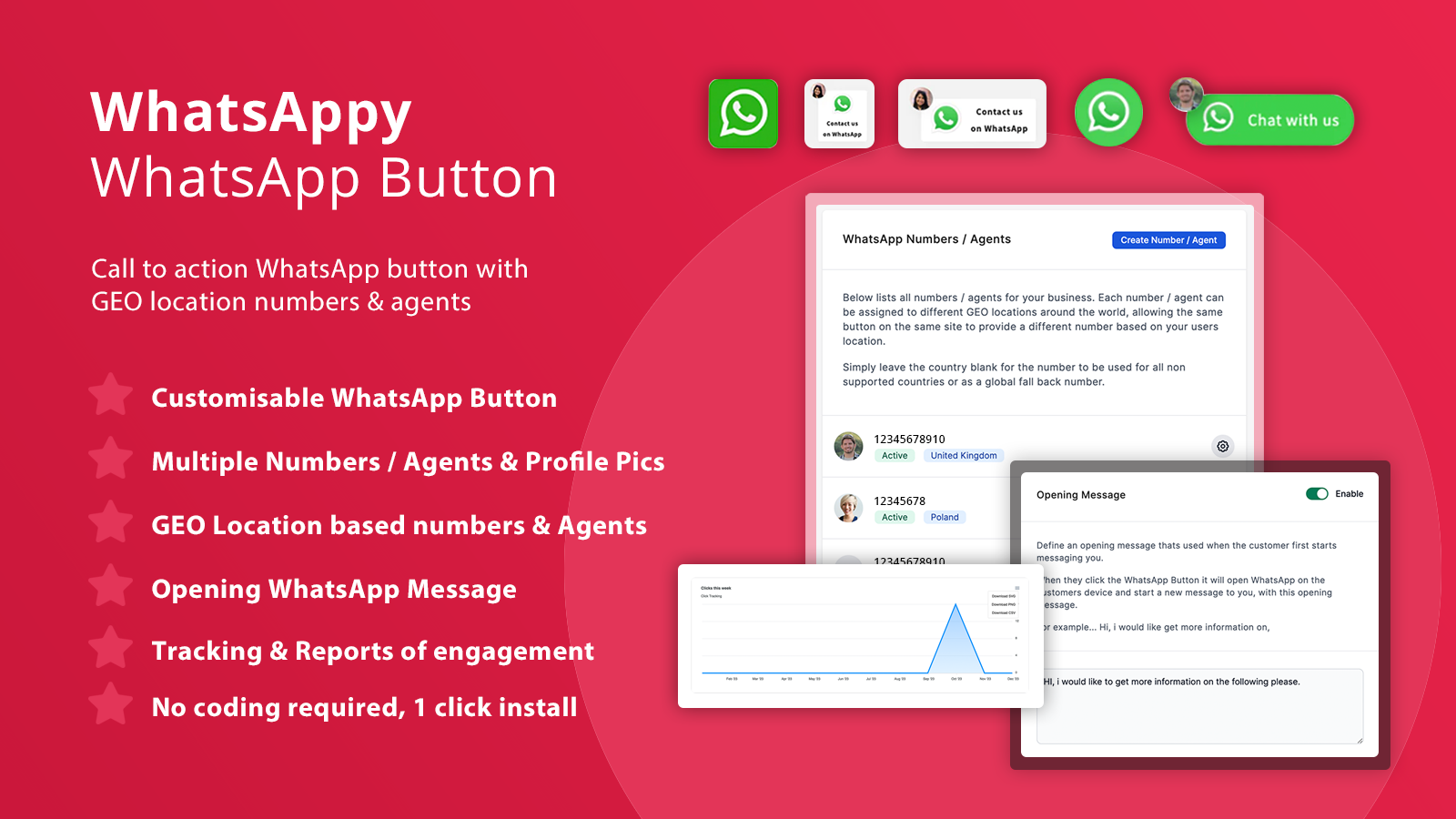 WhatsAppy makes it super easy to display a call to action button on your storefront which is highly customisable & offers an opening pre-filled message. The ability to add multiple numbers / agents & assign them to a country allows for a more tailored response to customer questions & support. Tracking the clicks of the button helps merchants see the locations of where questions are coming from, the devices used, & how many customers proceeded to send the message after clicking.