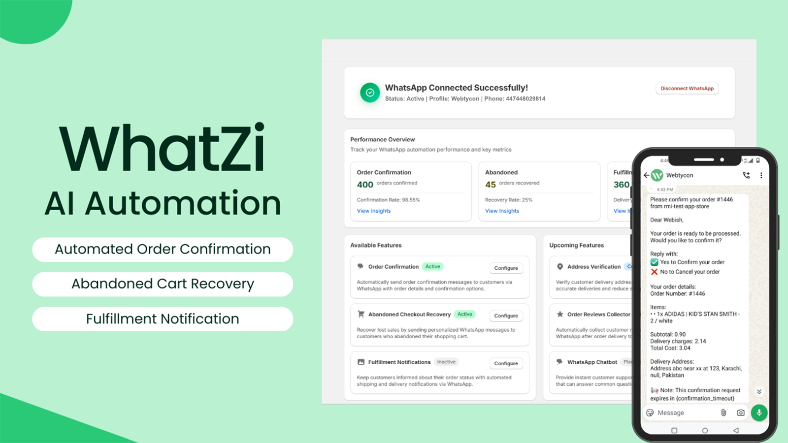WhatZi - WhatsApp AI Automation solves manual order confirmation issues that waste merchant time and slow customer interactions. It sends automatic WhatsApp messages for order confirmations, processes customer replies, and updates order statuses in Shopify. The app integrates Shopify with WhatsApp to handle order confirmations, abandoned cart reminders, and fulfillment updates from one dashboard. This reduces manual tasks and improves order management efficiency.