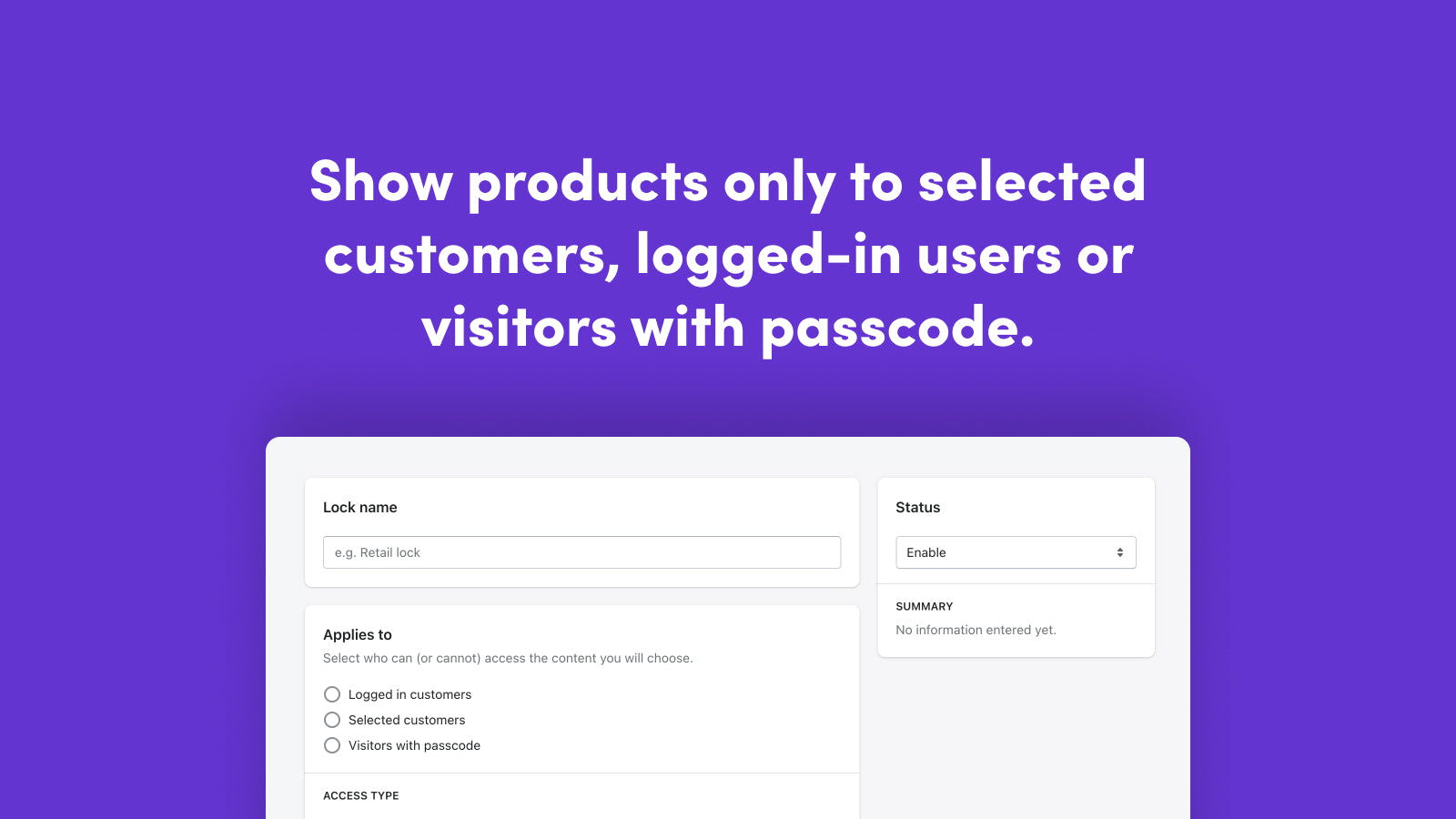 Lock or hide price, products, collections, specific pages or set up password with just a few clicks.