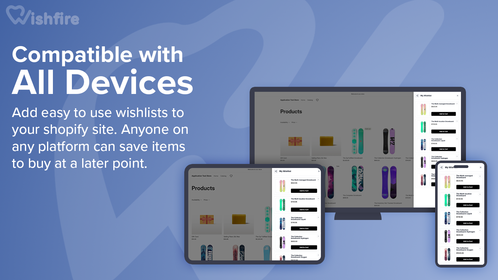 Wishfire is an easy to set up, and easy to use wishlist app. You have extensive customization over how your wishlist looks to customers and guests, as well as control over what features are shown and used on your storefront. We provide merchants with a way for customers to save products before they want to buy them, or share products that they'd like to be gifted. Wishfire also offers deep analytics showing merchants information on conversion revenue from Wishfire.