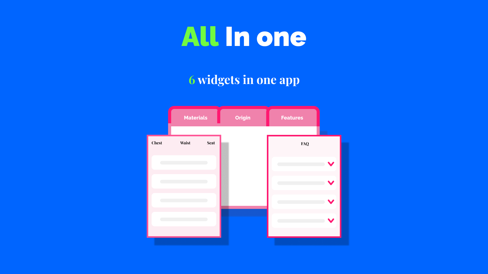 Wonderful Widgets allows you to improve your product page by assisting you in comparing products with comparison tables,helping customers find their sizing with a sizing chart and with the help of 5 other widgets display product information in a clear and concise manner to provide customer clarity and confidence.