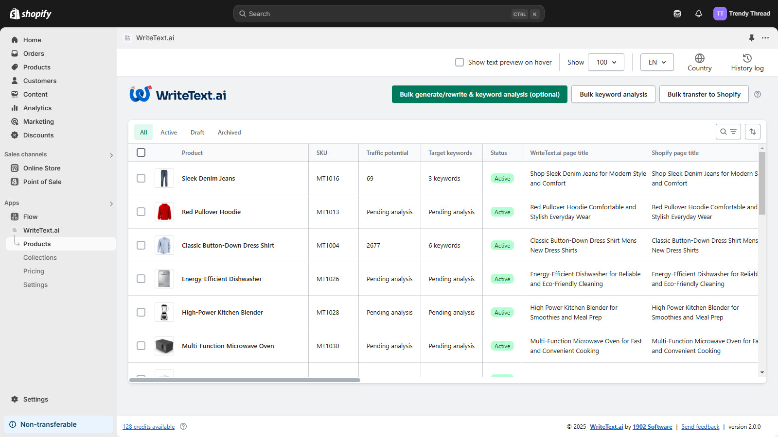 WriteText.ai 2.0 transforms Shopify content creation with AI-driven product descriptions, SEO-optimized meta tags, and automatic updates via a keyword optimization pipeline. Enhance visibility effortlessly with competitor insights, bulk generation, streamlined product grids, multi-language support, and AI-powered image analysis.