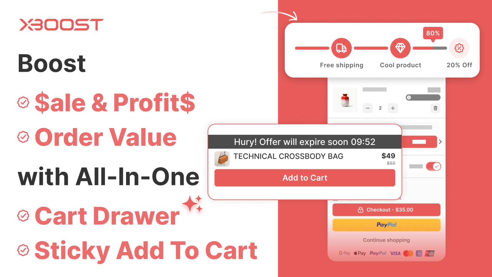 Xboost is optimized to enhance both AOV and CR with targeted features. For AOV, AI-Powered Cart Upsell recommends relevant products, and Cart Addons like Shipping Protection add value to each order. For CR, the Free Shipping Bar encourages higher spending, Sticky Add to Cart keeps the cart accessible, Trust Badges build trust, Announcements with countdowns prompt quick action, and Express Payment streamlines checkout. With Xboost, create a seamless, revenue-boosting cart experience.