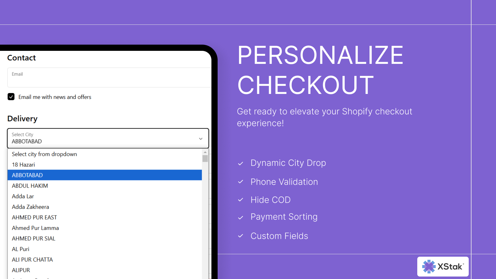 XStak: Easy Checkout is designed to customize the checkout, creating a seamless and optimized purchasing experience for customers. With XStak: Easy Checkout, merchants can streamline the checkout flow through features like convenient city dropdowns for faster address entry, phone number validation for accurate contact, and the ability to reduce errors in shipping. The city dropdown helps ensure that the correct city is selected, improving the accuracy of shipment details.
