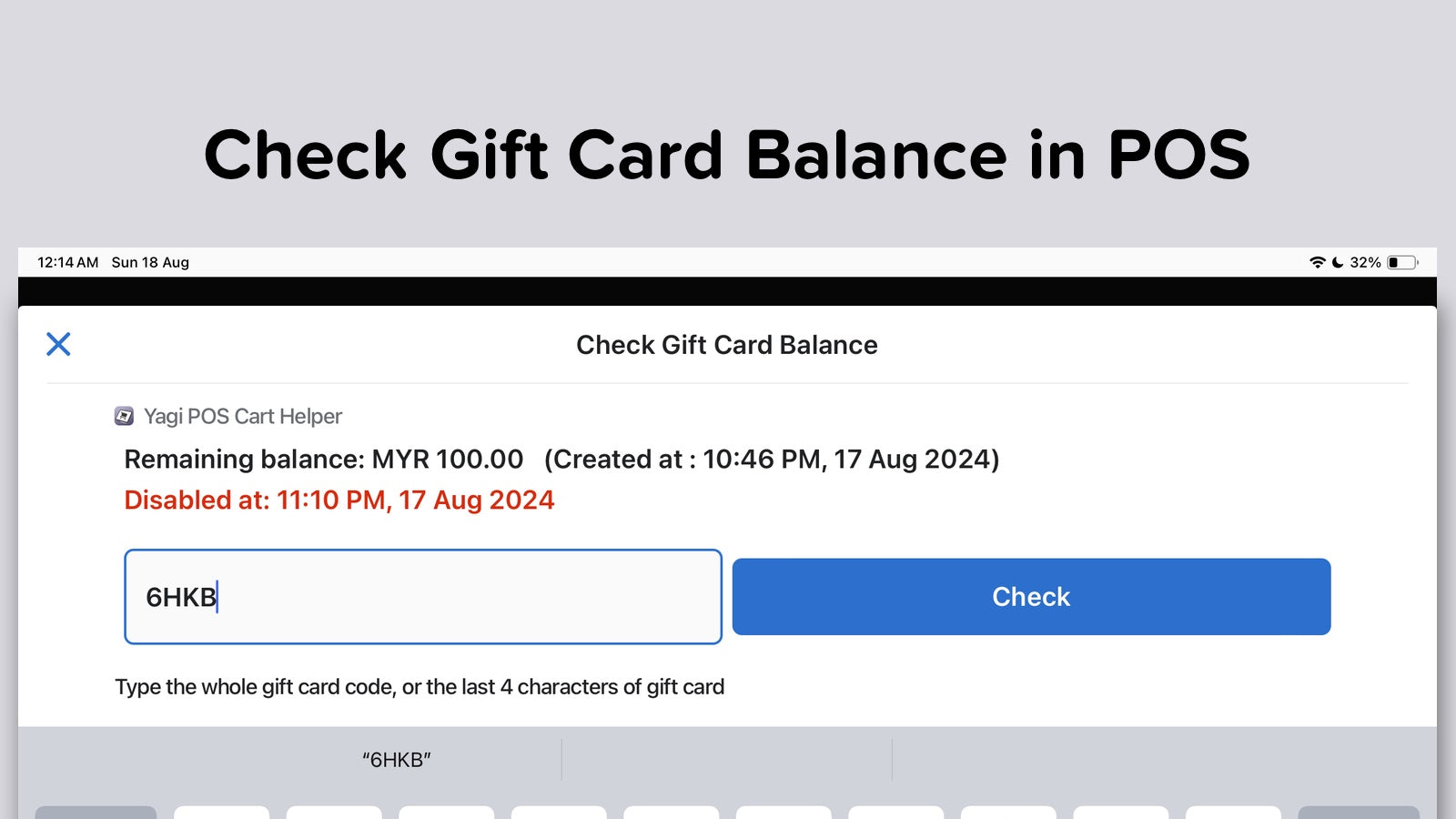 This app allows merchant to save current cart data from the POS, and retrieve the cart data later on, so that merchant can continue to serve the customers later on without having to input cart items again. The saved carts data is accessible from multiple POS devices and Shopify Admin, and can be converted to and from draft orders. Merchants can add products quickly with a single tap, and undo mistakenly added product with a single tap. Merchants can check gift card balance easily in POS