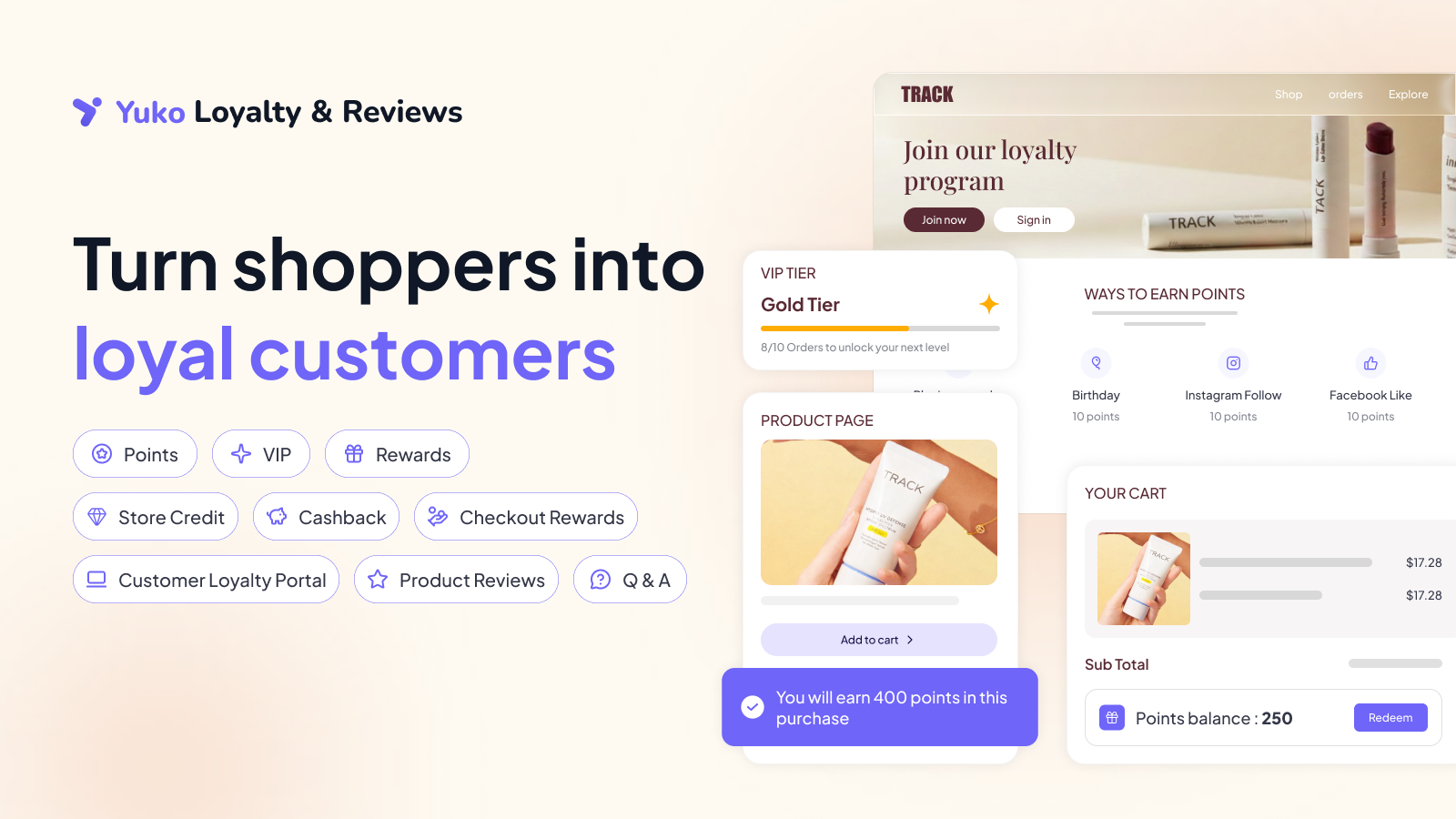 Loyalty points program with loyalty and rewards, VIP tiers, product reviews to build loyal customers