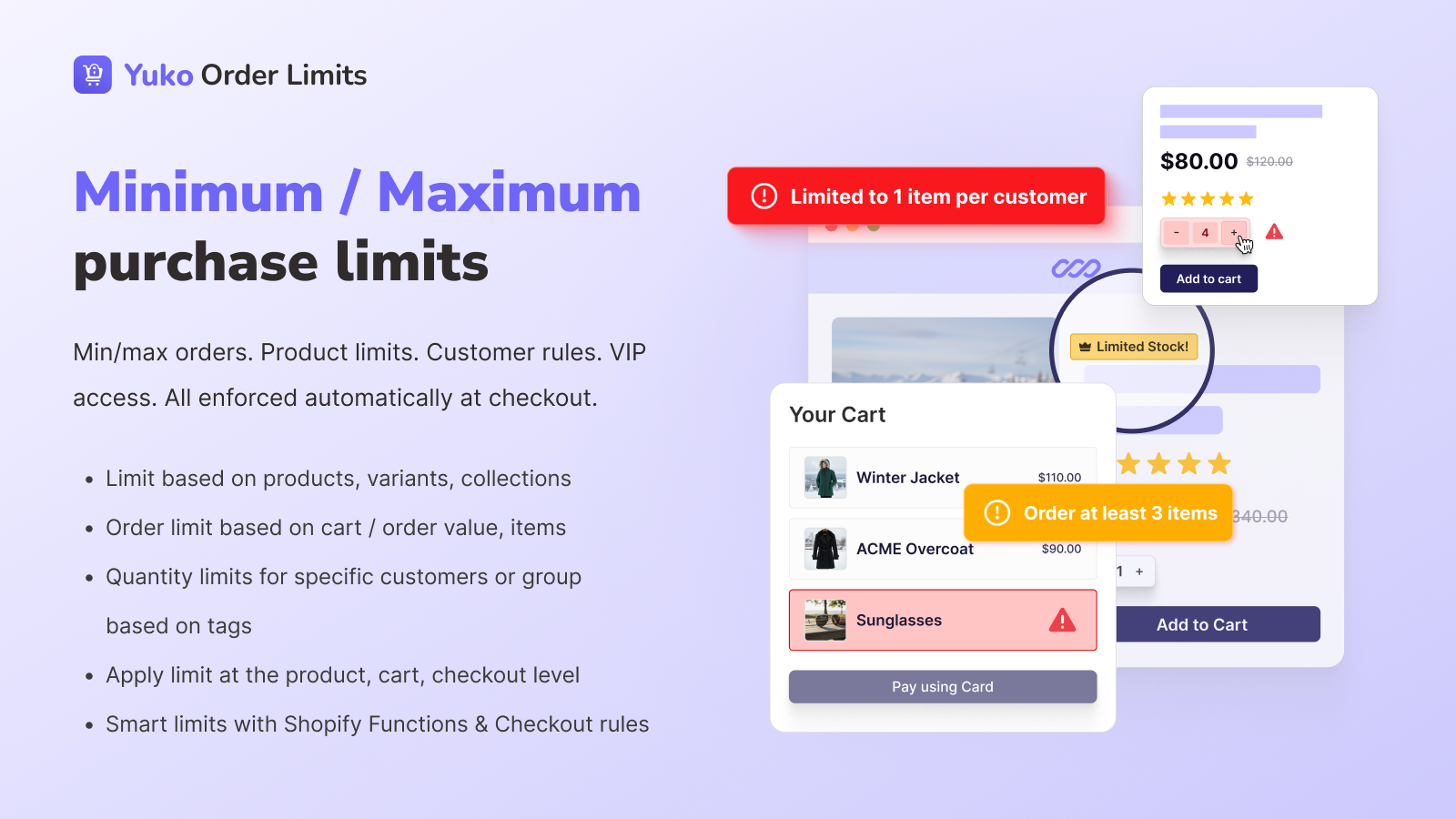 Yuko Order Limits helps you take control of how your products are sold. Easily set minimum and maximum quantities your customers can purchase. No more over-ordering or low-quantity checkouts — the app does exactly what it says, simply and reliably.