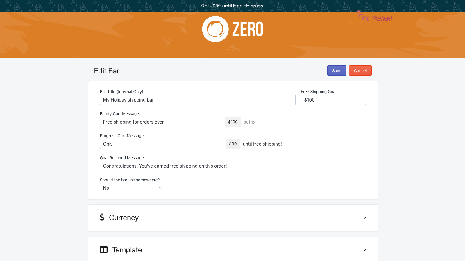 Free shipping has become an expectation in this new online shopping world. With fluctuating and often expensive shipping rates, offering free shipping on all orders is not cost effective. Take a hint from the large retailers and start rewarding your customers with free shipping after they spend a certain amount. With Zero you can create bars that update automatically, showing your customer how much they have left until they get free shipping.
