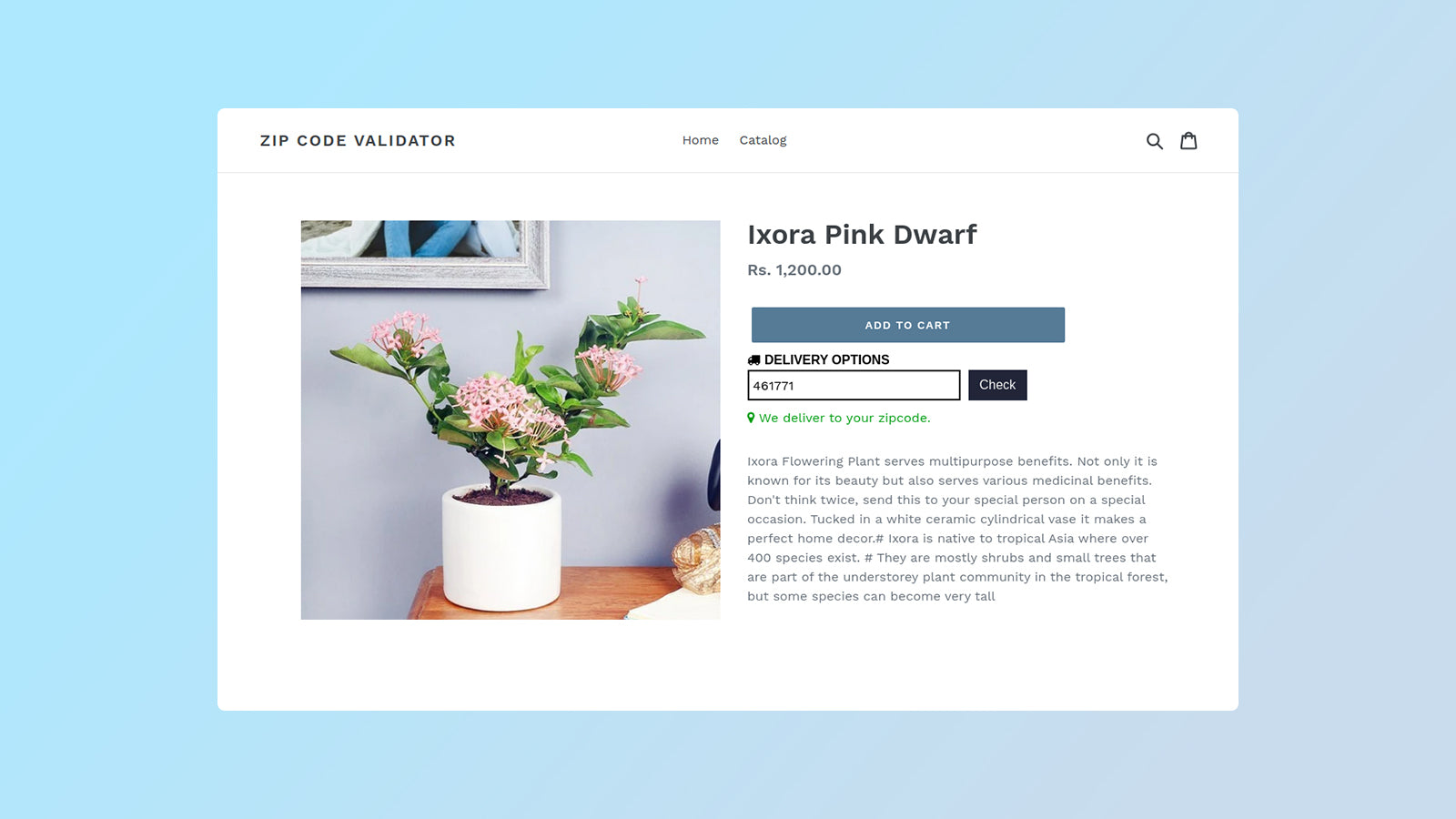 Zip Code Validator App is to act as a zip code verifier. The app will be visible on the product page only. The "Add to cart" and "Buy it now" buttons will be disabled if the zip code is entered. This way the customer will not be allowed to go to the checkout or cart page. It's a white list of serviceable zip codes.The validator can be enabled for all products or for any specific collection.The main purpose is to avail product delivery only to available zip codes.