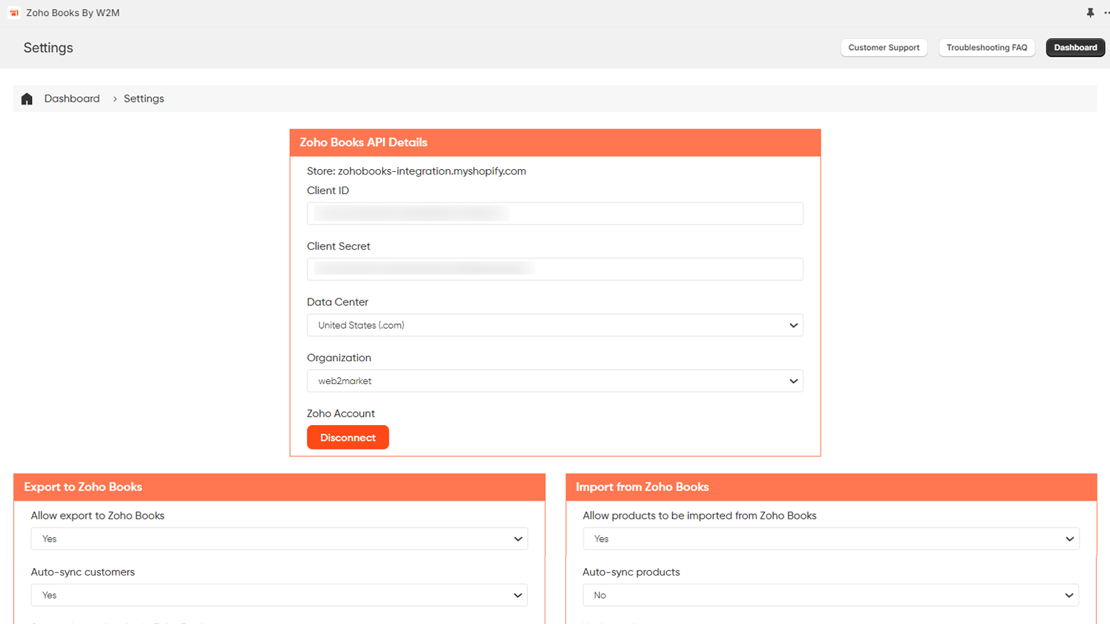 Automate the flow of data between Shopify and Zoho Books. Save money, reduce customer service issues, and make customers happier. Customers, Invoices, Orders, and Payments flow automatically from Shopify into Zoho Books. Future releases will update product and inventory data automatically in Shopify from Zoho Books. Web2Market is an advanced Shopify partner, and we have hundreds of happy customers who are already using this integration. * You must have a paid Zoho Books subscription.