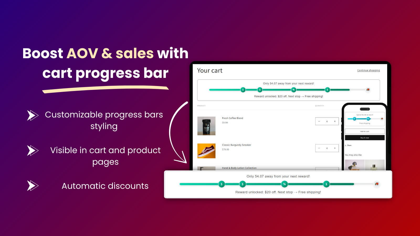 Boost AOV and sales with a cart progress bar that rewards customers with discounts and free shipping
