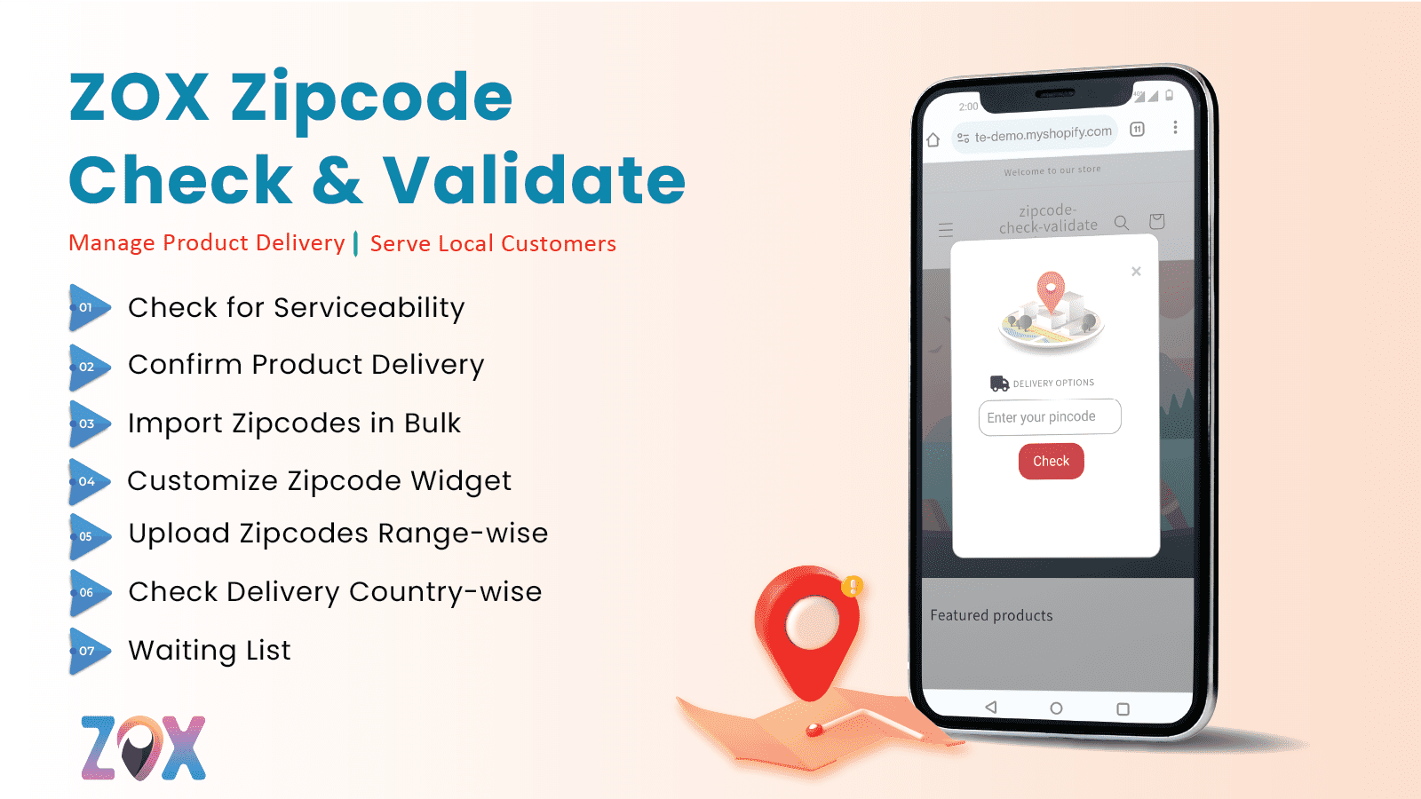 ZOX supports auto location detection, letting customers instantly check if delivery is available in their area. Upload a CSV or set zip code ranges to manage service zones and block orders from unreachable areas. Visitors can also submit their contact info to get notified when delivery becomes available. Streamline your logistics and boost customer satisfaction with ZOX.