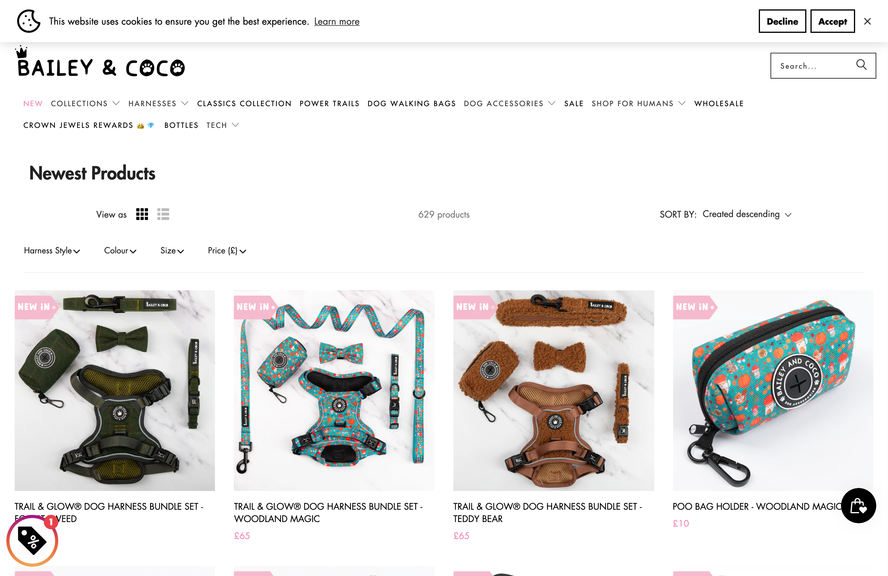 Bailey and Coco is a new dog brand entering a highly competitive market. The store owner requested a fluid website that adhered to a specific design across various pages. Key functionalities included integration with Klaviyo, Facebook, Google Shopping, ads, and analytics tracking, along with the implementation of a loyalty system. Additionally, the site was designed to support five languages and currencies for the Google feeds.